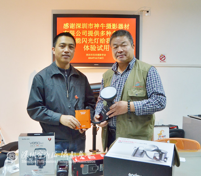 2014年12月30日,神牛摄影器材有限公司销售经理彭理来到学会,为学会提供近万元的设备,其中有2台影室灯闪客600、1台便携外拍灯AD360、1台锂电机顶灯V850、2套FT-16引闪器,给了学会摄影师们一个全新的神牛摄影器材新体验。借此时机,学会近期会组织人像拍摄活动,请及时关注学会动态。