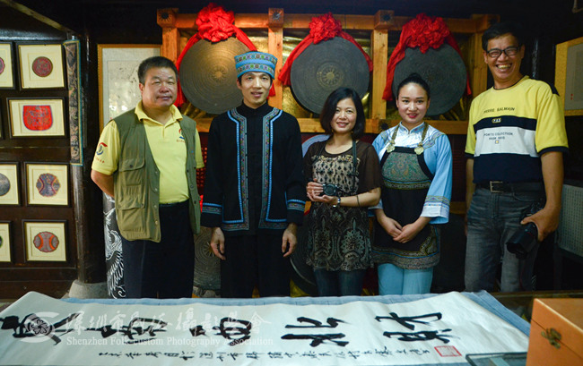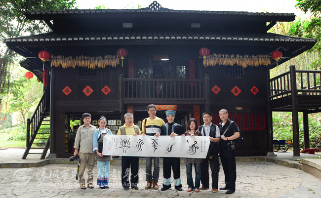 深圳锦绣中华民俗村是目前世界上面积最大、内容最丰富的实景微缩景区,被誉为“一步迈进历史,一天游遍中华”的中国历史文化、旅游文化之窗,是个荟萃各地民族民间艺术、民俗风情、民居建筑于一园的大型文化游览区。采风期间,白峻峰秘书长等一行边参观边拍摄,特别是在锦绣中华民俗村水族村寨,对古老的水族文化和民俗民风产生了极大的兴趣,水族古老的文字文化、精美绝伦的独特刺绣艺术——马尾绣等非物质文化遗产令白峻峰秘书长等一行惊叹不已;景区专职水书先生潘文浩还为白峻峰秘书长等献上了水族书法<龙凤舞水乡>等墨宝。