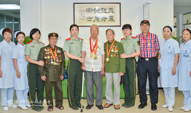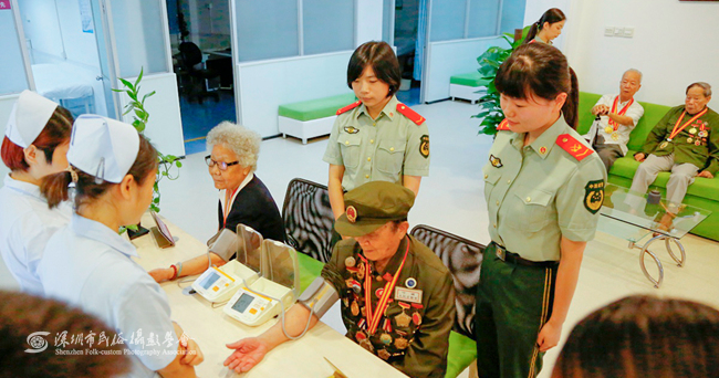 观看文艺演出前,曾发、曾志光等抗战老兵还在医院官兵的陪同下参观了总医院的门诊部、体检科等,接受了热情温馨的体检服务。近年来,武警边防部队总医院(即“深圳武警医院”)非常注重政治建警、文化强警,全力组建荣誉室、文体活动室、电脑学习室、图书阅览室和特色腰鼓队,把警营文化建设贯穿于为兵服务和医疗保障工作中。医院还通过举办新闻报道员培训班、开设局域网“文化园地”等多种形式,使学习科学文化知识活动蔚然成风,推动了部队全面建设健康、协调、持续发展。总医院还积极倡导官兵开展学唱一首好歌、阅读一本好书以及群众性的乒乓球、羽毛球、足球等文体活动;积极参加部队及驻地举办各类文体活动和比赛,多名官兵的摄影作品在地方摄影比赛中获奖;先后与深圳广电集团等共建单位开展警民联谊活动,交流文化,共享资源;联合深圳市委宣传部和市血液中心等单位,开展了“同献爱心血、共筑中国梦”、“圆梦中国、共享阳光”主题文艺晚会以及“摄影、书画进警营”等活动,有力地推动了警营文化建设,活跃了官兵文化生活,为提升部队战斗力提供了强有力的政治保证。