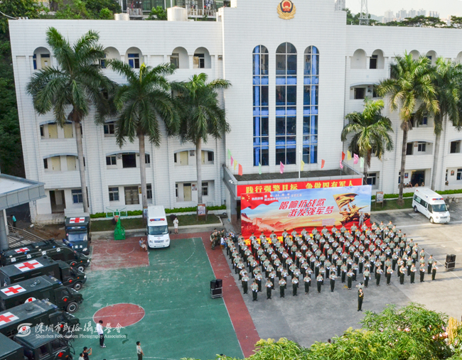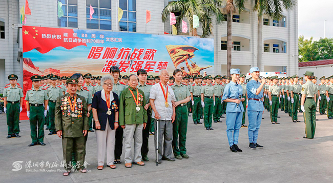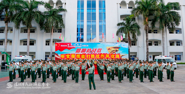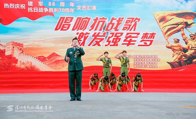 “忆往昔,峥嵘岁月,革命先辈前仆后继;看今朝,铸魂砺志,强军目标指引方向。”7月28日下午,武警边防部队总医院卫训大队营区内掌声阵阵,群情激昂。一场以“唱响抗战歌,激发强军梦”为主题的庆祝中国人民解放军建军88周年暨中国人民抗日战争胜利70周年文艺汇演在这里举行。该医院官兵和部分抗战老兵代表以及深圳大学金钟音乐学院、深圳大学青年艺术团师生等约500人参加了此次活动。深圳市民俗摄影学会多名会员现场拍摄,为此次活动留下了珍贵图片资料。