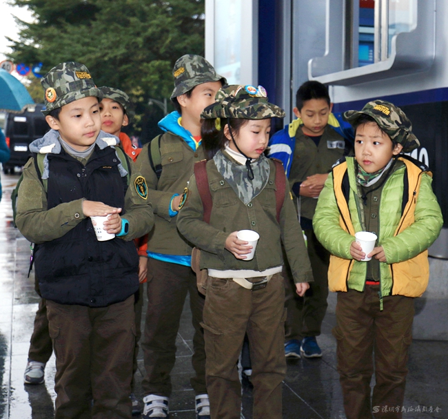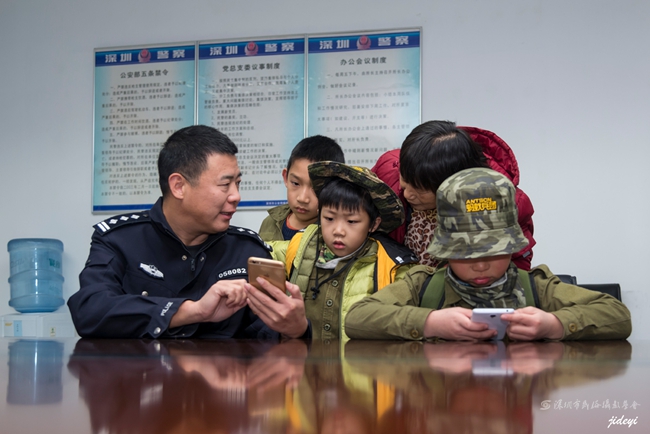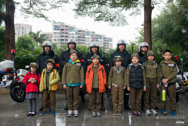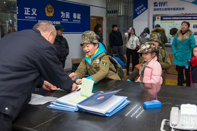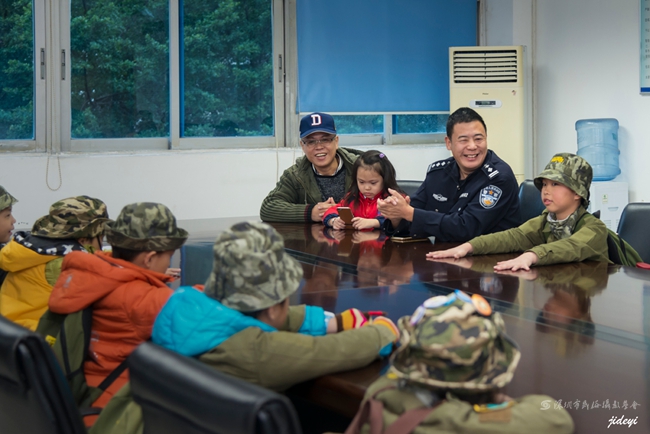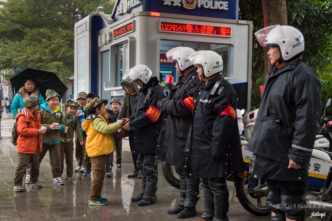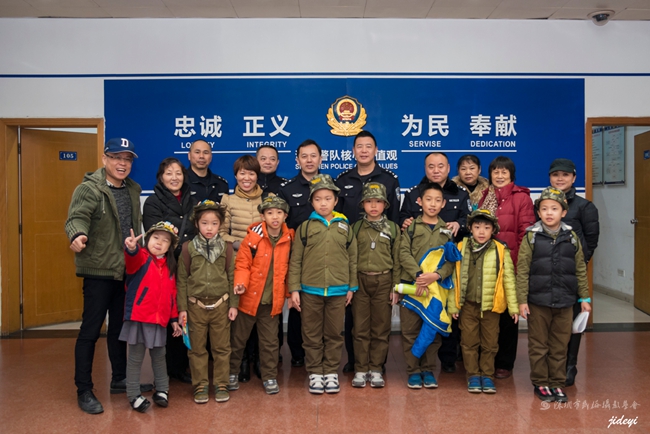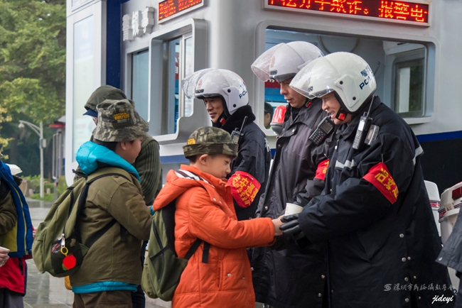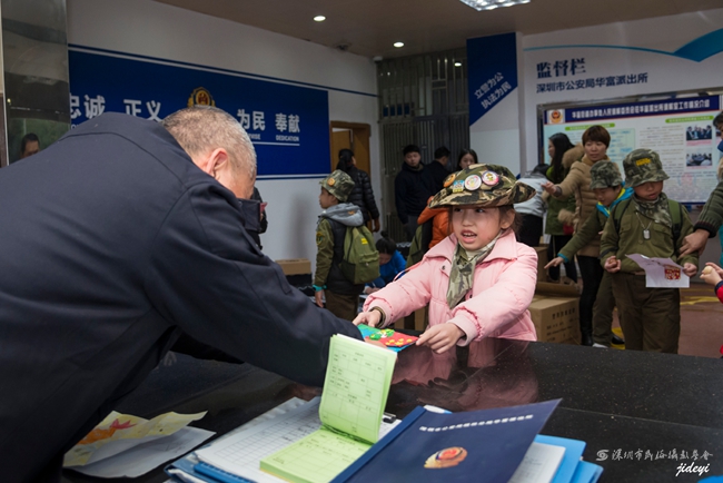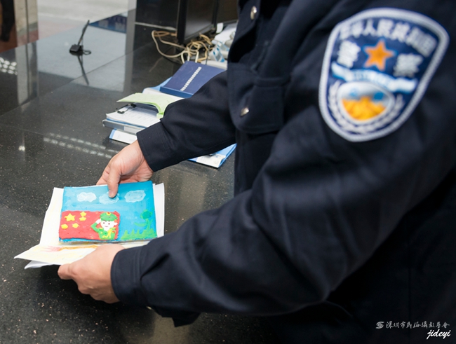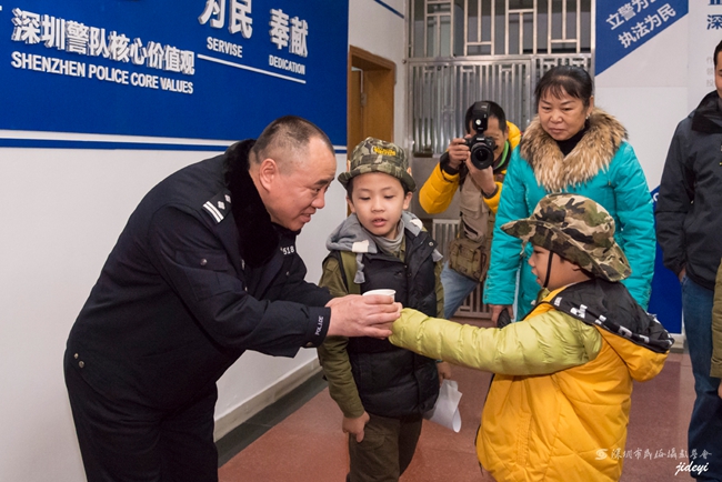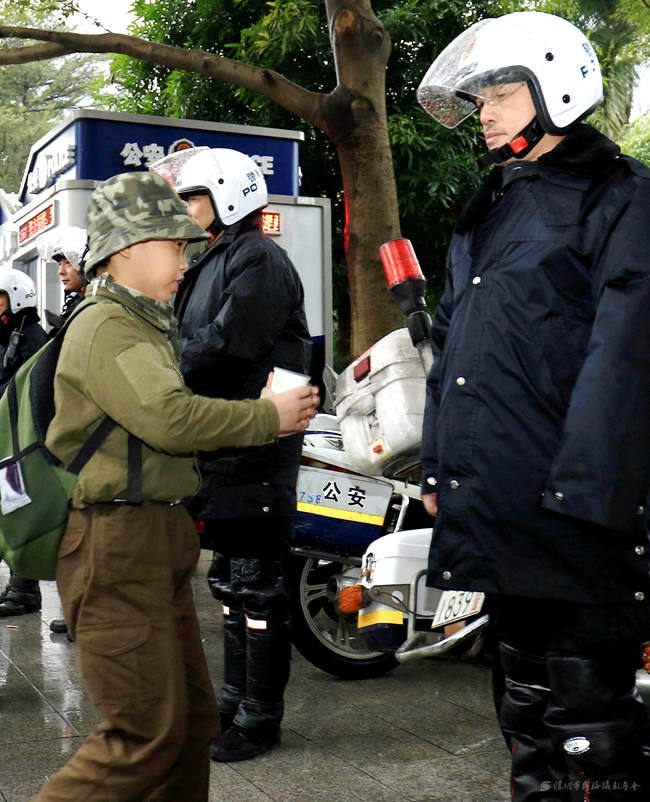 1月26日下午,“蚂蚁兵团”福田雄鹰队的7名队员在家长的带领下,冒雨来到了福田华富派出所,看望“爱心叔叔”马财和(风雨无阻)在一线坚守岗位的警察叔叔们。为风雨中的他们送上一杯热气腾腾的姜汤暖身,还有自己亲手精心制作的礼物,并向他们致敬,学习他们的坚强、奉献精神。