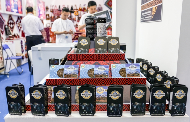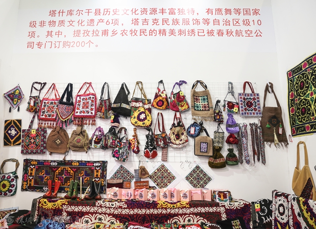 塔什库尔干县参展团展位在4号一带一路馆。展馆以浓厚的塔吉克族风格结合独具特色的展品,以文博会这个平台大力推介塔什库尔干县文化产品、文化旅游、项目招商、旅游推介等,向世人展示塔吉克民族悠久厚重的历史文化、独具特色的塔吉克族民俗风情。塔什库尔干县精心挑选的最具特色的展品参展,其中包括牦牛肉、塔吉克手工艺品、服饰等。