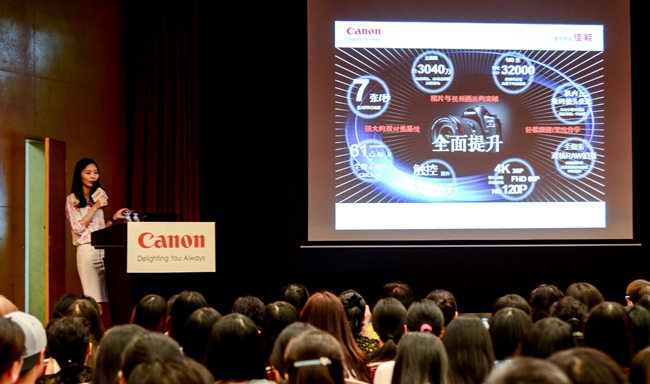 同时向来宾介绍佳能的历史发展及文化。通过PPT向大家展示佳能产品的历史变迁直至前两日新刚推出的新品5D4。让大家感受EOS摄影文化,畅想拍摄新体验的过程。
