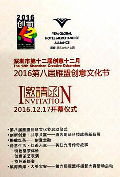 2016年12月17日在“创意十二月”之际,诚邀100名深圳市摄影师走进雁盟酒店文化产业园,进行摄影采风创作活动。届时雁盟园区内将举办酒店用品科技成果新品展,根雕红茶—创意金融,现场擂茶,茶艺表演,特色茶虾宴等系列精彩活动。同时,100名摄影师在雁盟所拍摄的作品可用于参加第六届“雁盟杯”摄影大赛。