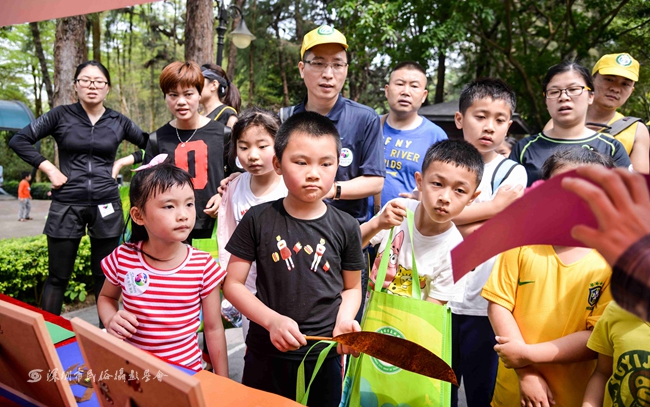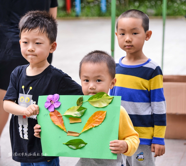 志愿者引导开展森林落花落叶,小朋友现场DIY制作