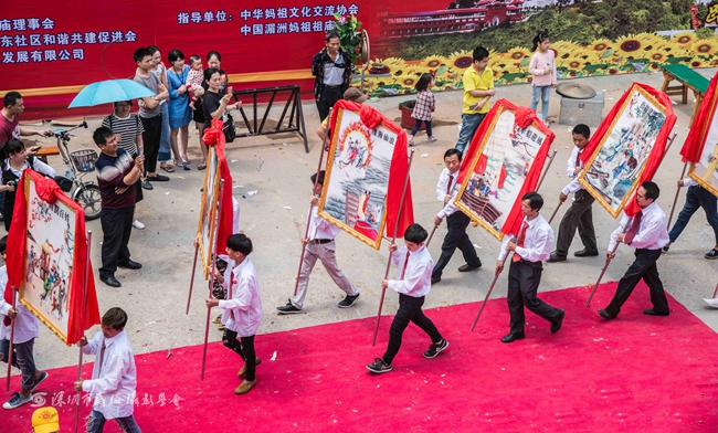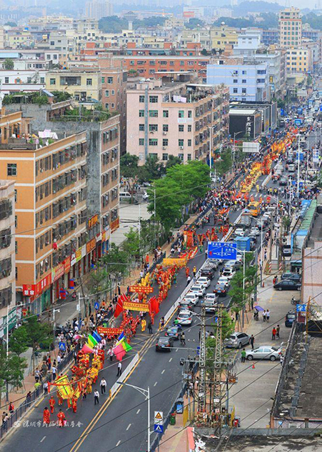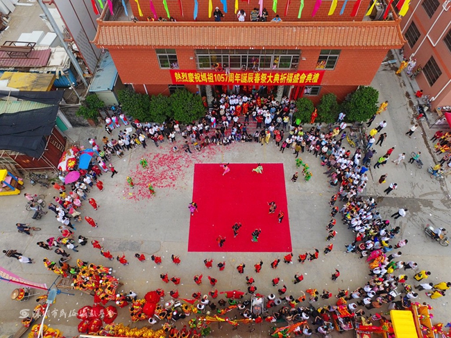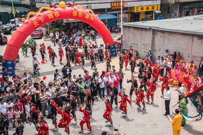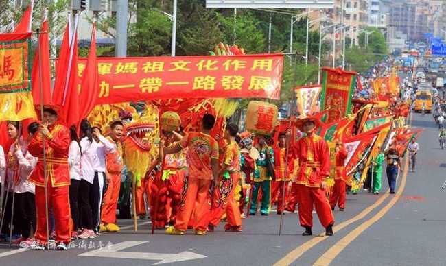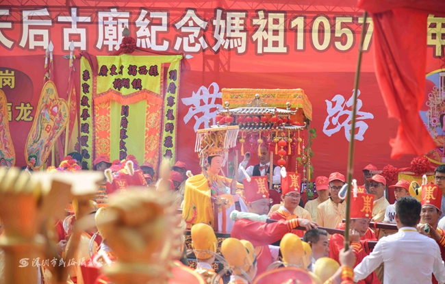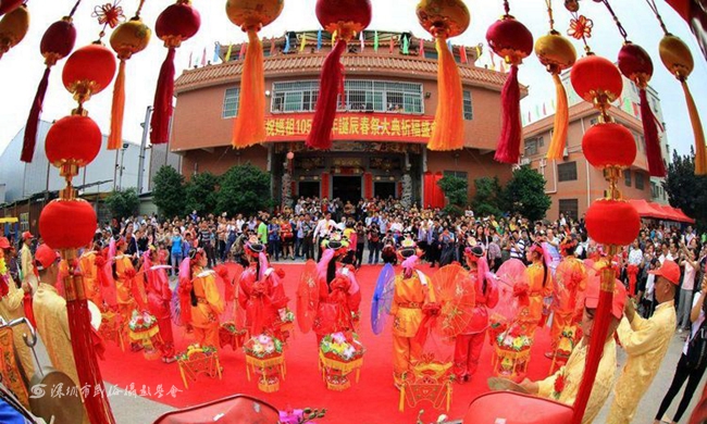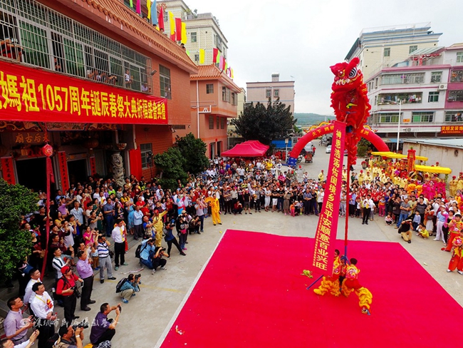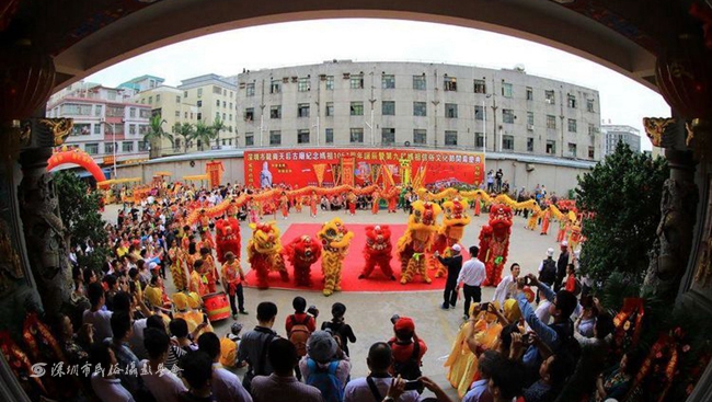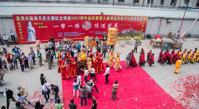 2017年04月9日,广东省深圳市,具有近二百年:历史的深圳市龙岗天后古庙在龙岗龙东社区举办第九届盛大的妈祖信俗文化节。天后古庙所在的龙东社区“原著”居民与以潮汕籍为主的社区新移民近3万多人一起组成多个方队在活动中亮相。独具多个地方特色的“英歌舞”,“醒狮”,“潮州大锣鼓队”“舞龙” “秧歌舞”“腰鼓舞”等表演项目精彩呈现,同时巡游队伍中展现了妈祖事迹图片展,今届活动更具有地方文化特色。开幕式同时举行‘中华妈祖文化交流协会常务理事单位’‘中国湄洲妈祖祖庙分灵庙’挂牌仪式。中华妈祖文化交流协会、中国湄洲妈祖祖庙的相关领导参加本次活动。