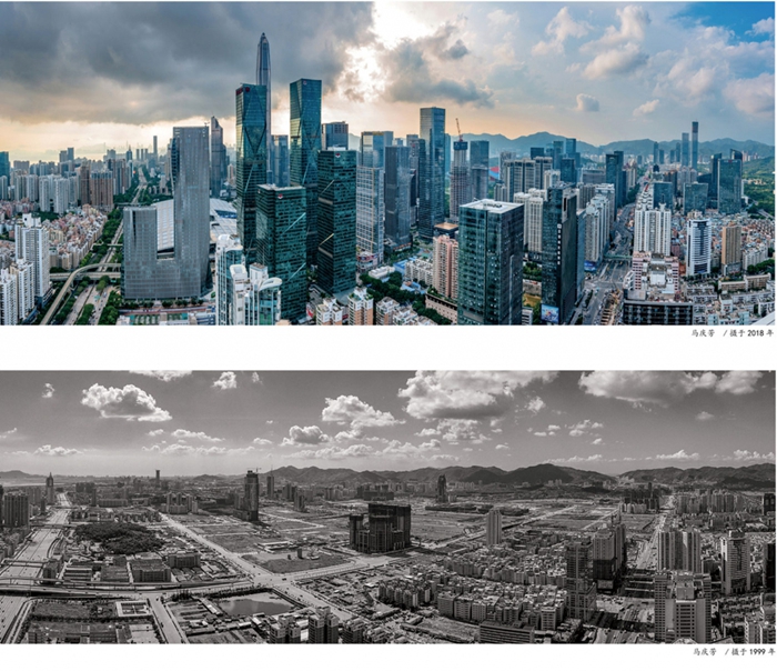 深圳任何一个片区的发展,都可以用日新月异来形容,这当然包括深圳中心区。上世纪 90 年代,福田这一带还有大片的土地等待开发。那时候,这一片区的地标——深圳特区报业大厦刚刚建成,深圳商报社大楼还没竣工。深圳商报社与老山姆(现景田沃尔玛)之间,还是一片空地,还可以彼此相望。下图为 1996 年拍摄,中心区建筑密度不高,可见大片空地,左侧最高的那幢楼是联合广场,中间那片绿色小山包,则是现在会展中心所在地。上图为 2018 年同址拍摄,深圳中心区已变成建筑森林,而高耸入云的平安金融中心已成为深圳的新地标。