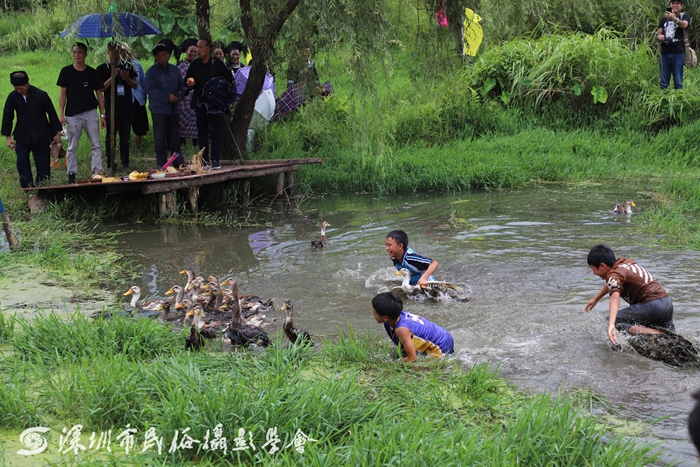 水族卯节,水语称“借卯”,意为吃卯,又被称为“歌节”、“东方情人节”,是水族最隆重的年节之一。卯节还是促成水族青年男女婚事的日子,水族适婚青年男女们在卯日纷纷登上卯坡,倾情对歌,互表爱意,遇到有缘人,两人情投意合后便会一起牵手情人谷、喝龙泉水、拜神树、祈石神,祈祷神的庇佑,白头偕老。一些慕名前来“过卯”的游客,抵挡不住卯节活动热闹场面的“诱惑”,也纷纷参与到活动中。祭稻田是水族卯节的重头戏,活动中,水族妇女们身穿节日盛装,分散在稻田四周,手摇马尾草,寓意驱赶害虫。在稻田另一边,祭台上摆着米酒、糯米饭等贡品。吉时一到,祭师边向前方抛洒米粒,边念着水语祝词,接着,祭师请水族汉子把鸭子驱赶进稻田,早已在岸上守候多时的水族青年随即跳入稻田里追扑鸭子,上演“人鸭大战”,“观战”的人群中笑声不断,现场热闹非凡。最终,鸭子被年轻力壮的青年男子们“擒拿”上岸,寓意风调雨顺、稻作丰产、人寿年丰。采风团成员们用相机记录下这欢乐时刻,体验了三都古老、神秘的水族习俗,也深深感受到水族人民的热情好客。