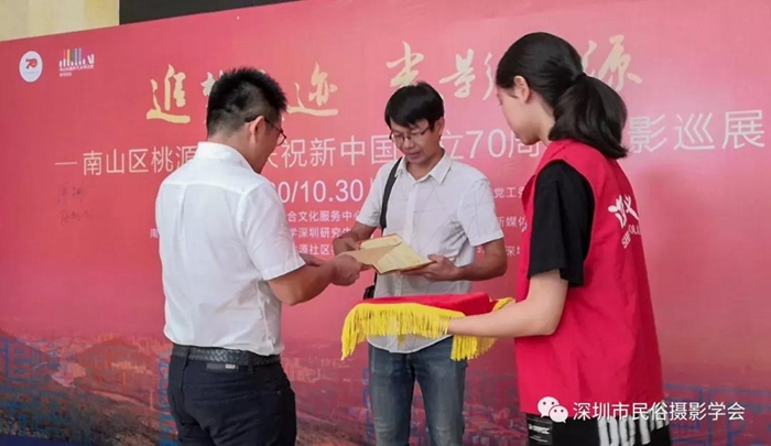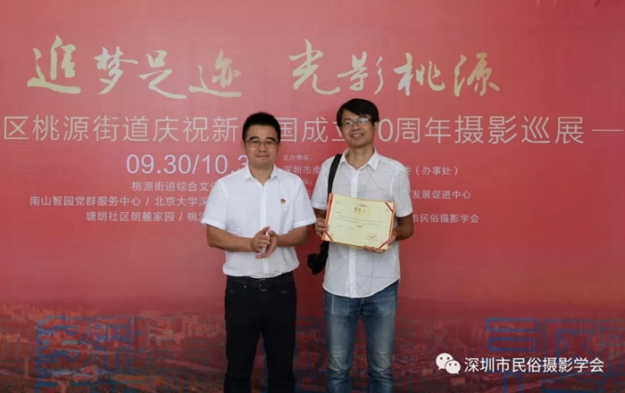 深圳市民俗摄影学会会员欧岳琦的摄影作品《阳光初照桃源美》获得大赛的一等奖。欧岳琦作为获奖摄影师代表,南山区委常委、宣传部长廖子彬为其进行颁奖。