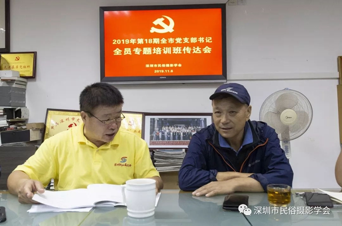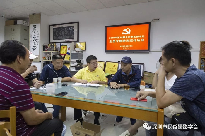 2019年11月6日,深圳民俗摄影学会党支部在学会办公室举办第18期全市党支部书记全员专题培训班传达会,支部书记刘对现,支部委员马庆芳、李群、马锐,党员刘培忠,积极分子王东海,学会副会长石践及驻会工作人员参加。