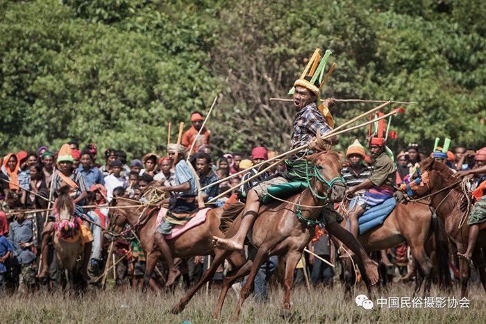 组图说明:印尼偏远的小村还保留着古老的民间巴梭拉节。每年二、三月,人们就开始准备庆祝巴梭拉节。离家的人要回来,祭奠逝者、准备牺牲。节日的最后一天,人们聚在旷野,开始他们最奇特的祈祷丰年的仪式。男人们骑上马,以最快的速度奔驰,同时向对方抛矛。现在,人们不再使用锋利矛。但是,还是会出现流血受伤的情况。但是,人们流血是好运,会带来来年的丰收。
