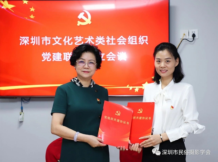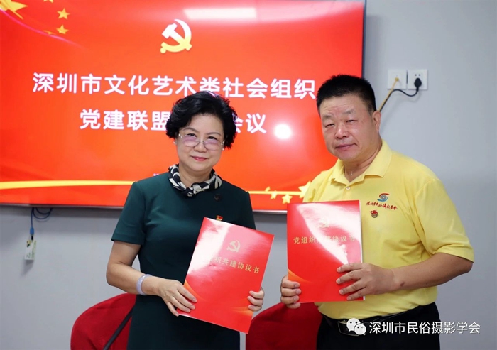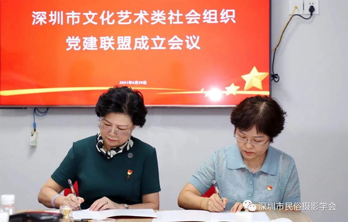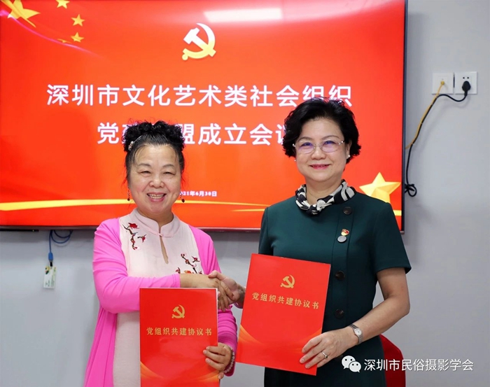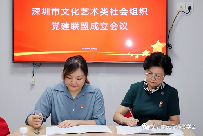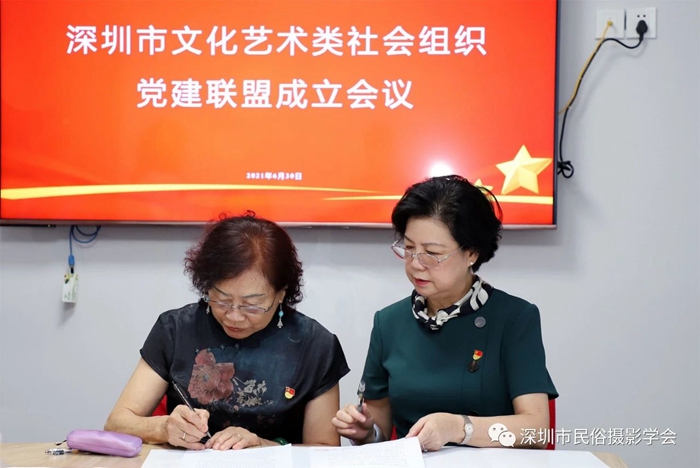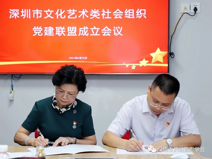 为创新开展深圳市文化艺术类社会组织党建工作,实现资源整合、优势互补、互利共赢、共同提高,激发党建队伍活动,助推党建工作迈进新台阶,2021年6月30日上午,在中国共产党百年华诞前夕,由中共深圳市文创体育类社会组织联合委员会领导,深圳市群众文化学会党支部牵头发起的“深圳市文化艺术类社会组织党建联盟”,在深圳市民俗摄影学会隆重举行了成立仪式。