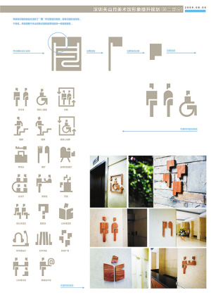 从外形上看,关馆改造前后的最大区别是,原本门口如庙堂般高耸的台阶变成了一个巨大的玻璃幕墙,如此一来,以往颇具古典意味的关馆一下增添了现代因素,并且由于地势的降低令观众有了亲切感。馆内部的装修延续了过去的大气、明亮,但在细节处也充满惊喜,这得益于其新启用的形象系统。而这套形象规划已入选今年全国美展的设计艺术展。“美术馆本身应该成为一座城市艺术水准的集大成者,细节的品位尤其重要。在国外,几乎每个美术馆都拥有自己的一套专属形象规划,并且开发了许多领域,如水杯、书夹等,一个美术馆就是一个品牌。”负责这次形象规划的关馆策划推广部主任颜为昕说。但在国内,这个领域还是空白,关馆则成了“吃螃蟹者”。这套形象规划涉及范围甚广,从新馆的标志到拐角处的指示标识,从视觉系统的色彩设置到名片、工作夹的设计,事无巨细,构成了一个整体形象。观众还能在其中发现探索的乐趣:新的美术馆标志脱胎于旧的标志,对“關”字篆体印章进行了巧妙的“整形”,在笔画组成的迂回小道中暗藏“关山月”三个字和“深圳”的英文缩写“SZ”,并在这个标志中选取一角作为元素,组成了独一无二的关馆专用的“洗手间”、“餐厅”等图示,仿佛散布在全馆各处的标签,与馆内以灰色为主的视觉系统共同形成了一个统一的气场。