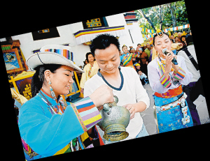 民俗村中游人与藏族青年一起欢度藏历新年。