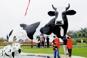 人们纷纷在一尊巨大的奶牛雕塑前合影留念。据介绍,这尊奶牛雕塑重30
