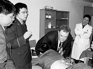 2006年4月,来自英国伦敦帝国理工学院的外科专家李·爱德华斯教授应邀到广东公安边防总队深圳医院做学术访问,认真观摩中医拔火罐。 深圳特区报记者 李伟文 通讯员 黄琦 摄