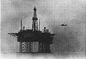 1987年4月初,南海西部石油公司调派“南海五号”石油钻井船前往涠洲岛附近海域的涠10—3油田,与这里的井口平台并体,开掘新油井。 李春年 江式高 摄