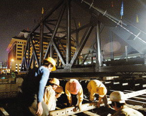 2004年5月8日晚11时,跨度40米、重达224吨的罗湖铁路新桥稳稳地跨过深圳河,