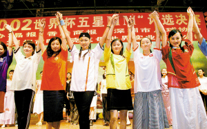 联合主办的“2002世界杯五星MM”评选的决赛。图为部分获奖者身穿各国球队衣服亮相。 郑东升 贾玉川 摄
