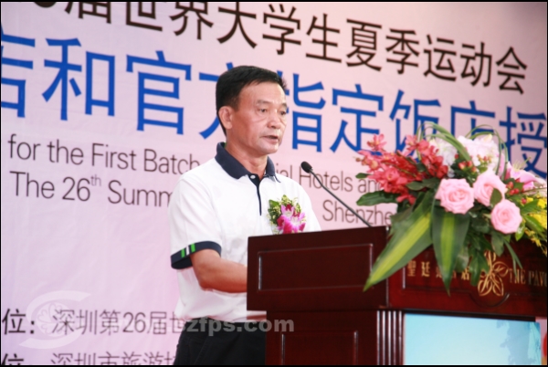 大运会执委会副主席、执行局局长梁道行出席授牌仪式并讲话。他表示,大运会是深圳经济特区成立三十年来首次举办的国际综合性体育赛事,希望获评的27家饭店能够秉承服务大运会的热情,以高度的主人翁意识和社会责任感,扎实有效、耐心细致地做好各项准备工作和服务接待工作。