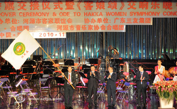 昨晚,在河源市体育馆举行的第23 届世客会会旗交接仪式暨“客娘颂”交响乐晚会,把6000 名客属乡亲和350 万河源客家人的心又一次紧紧地联系在一起。市政协主席陈志干主持会旗交接仪式。最高人民法院原院长肖扬,河南省人大常委会副主任贾连朝,台湾新竹县县长、世界客属总会会长邱镜淳,香港崇正联合总会总执行长黄石华等有关领导和知名客属人士、客属社团团长以及社会各界人士4000多人出席了闭幕式。当晚还举行了圣水圣土的交接仪式,市委书记陈建华、市长刘小华分别把从河源取出的圣土和圣水移交给“世界客家播迁路”组委会,并接受了该组委会赠送的“圣土望君归”纪念品。本届世客会大力弘扬客家文化,打造客家文化特色,让客家文化大放异彩,是全球客家人增加客家情谊、弘扬客家文化、共谋科学发展的盛会。
