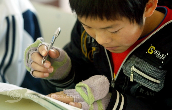 教室内没有暖气。在只有4度的气温下,学生们只有用口中的哈气给冻黑的小手补暖
