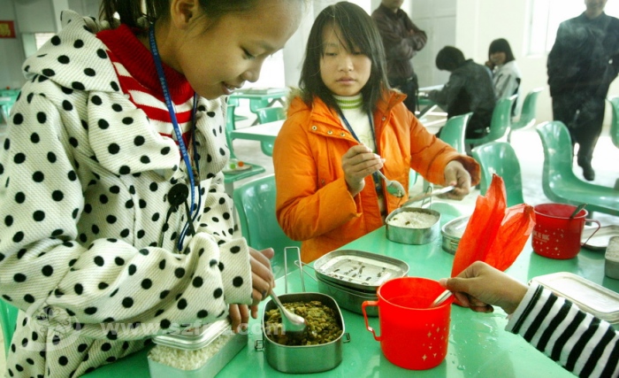 午饭时间到了,笔者随即到学生饭采访。胡副校长对笔者说:由于学生家庭都比较困难,学校虽然有较好的饭堂,但目前还做不到开学生食堂让学生买饭吃。学生都是从家里带米、带菜干在学校的提供的蒸炉里自己蒸饭。只见所有学生都是从按照男女生分开的蒸炉里取出饭盒,从塑料袋中取出从家里带来的咸菜或菜干送饭。笔者尝了一位13岁初一女生的菜干,一点油水也没有,又苦又咸。笔者问她:只有这一个菜吃吗?她点点头说:是啊,可以吃饱就行啦。另一张餐桌上,一位女生正打开一个真空包装食品。笔者走进一看,是一包梅菜加工的咸菜。笔者问她买这样一包要多少钱?她立即礼貌的站起来答道:五毛钱,一包可以吃两顿。在饭堂吃饭的学生,都是13到15岁的孩子,都是青春年少正在发育的年龄,却都是小脸蜡黄,没有一个显得面带红晕,没有一个白白胖胖的。所有的学生都是清一色的米饭加菜干或咸菜,竟没有一个有汤喝的。光吃饭不喝汤行吗?笔者问一位男生。男生似乎觉得笔者提问有点奇怪,反问笔者说道:有开水喝还不行吗?学校免费提供呐。笔者边看边联想深圳许多需要减肥的孩子们,不知是同情还是羞愧,一时竟不知道怎样回答他。