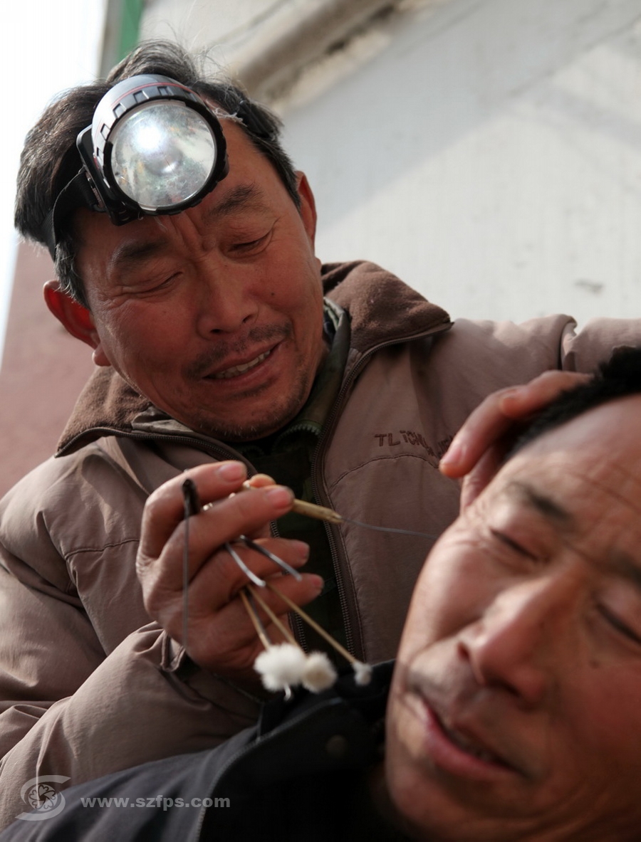 围观群众看到我脖子上挂着照相机,对掏耳师傅起哄道:电视台记者来照你了(当地老百姓似乎分不清照相机和摄像机,在当地多次遇到这种误解)。我借机举起照相机,掏耳师傅摆摆手:“这么丑,不要照”就停手不干了。我以为他不高兴,忙着解释和赔不是。掏耳师傅指着客人说:“他耳朵从小就没有掏过,耳屎又多又硬,要先用药水泡泡,泡软了才能掏,我也歇会儿”。