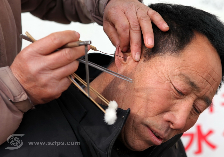 2011年春节前夕的一天中午,浴着冬日暖暖的阳光,我走出淮安汽车站等待同学来接。忽然,看到车站出口附近小餐馆门前居然有一个“专业掏耳朵”的广告。一位50来岁的师傅,头戴LED聚光灯,手握铰刀、挖勺、钩子、镊子、毛球刷等工具,聚精会神地为客人掏耳朵。客人的头偏向一边,眼睛眯缝着,看不出是痛苦还是享受,那表情让我想起某寺庙里啼笑皆非的济公塑像。