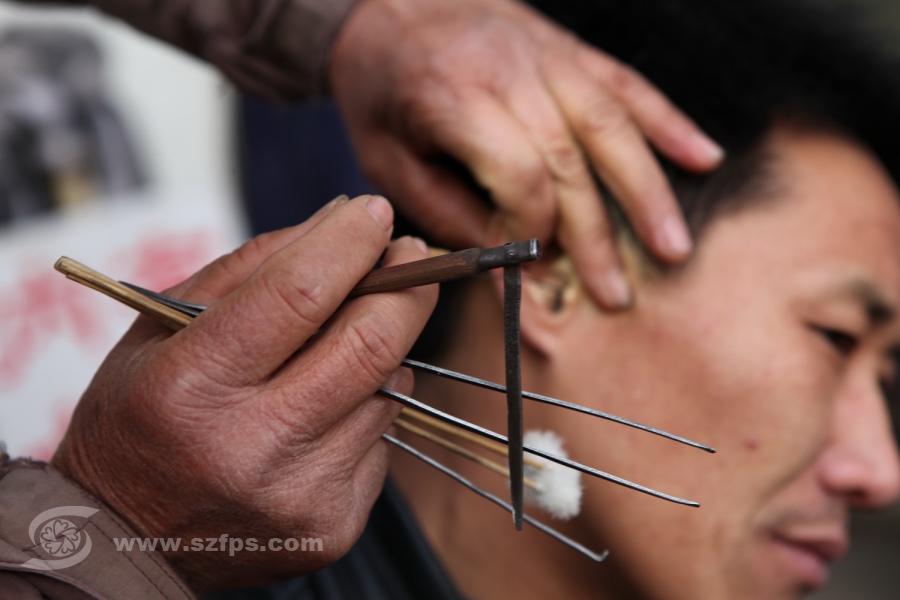 说起他家乡传统的理发业,他说:以前都是挑着担子走乡串户,那担子就像老百姓说的“剃头挑子一头热”,一头是炉子,烧热水给客人修面、洗头;一头是个小木柜,既是客人坐的凳子,也是剃头匠的工具箱。后来,温州发廊铺天盖地,追着乡村集市去摆摊的剃头匠要么找门面开理发店,要么就改了行。发廊里的小妹修面都不老练,更不会掏耳朵。我没钱开店,摆摊剃头又没生意,就把乡下剃头之后捎带着给人掏掏耳朵的活儿当成一门生意来做,苦是苦一点,但是没有多少人跟我抢,因为现在年轻人看不上掏耳朵这活儿,也吃不了学艺的苦。