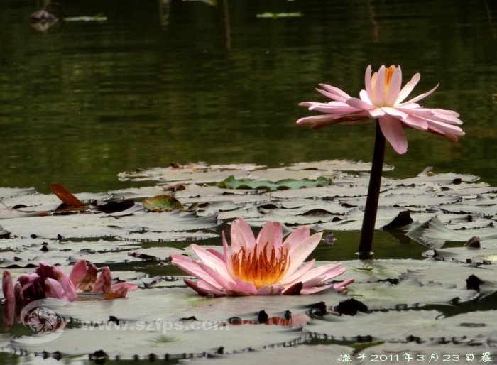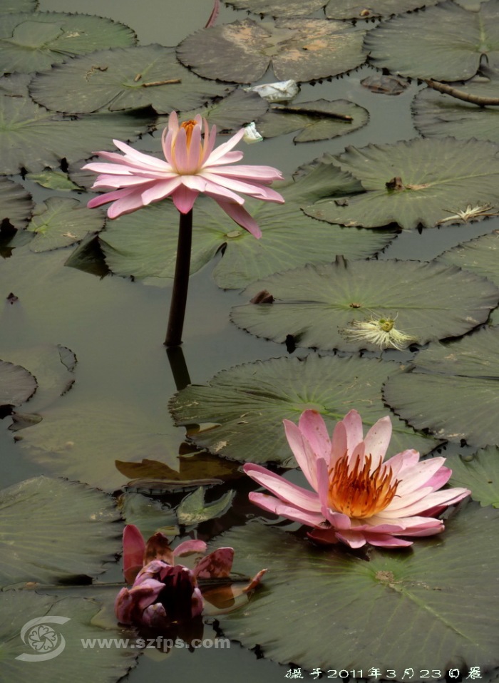 22日早晨,路过莲花山人工湖东北角,看到已经开了一段时间的3朵睡莲中,一朵有些颓态,另外2株亭亭玉立傲然怒放很是娇美。我停下脚步拿出随身携带的卡片机拍了几张,当时只是想留作将来的对比和纪念。