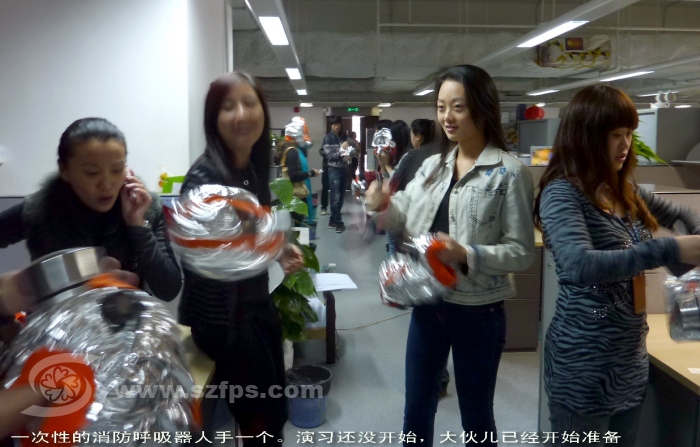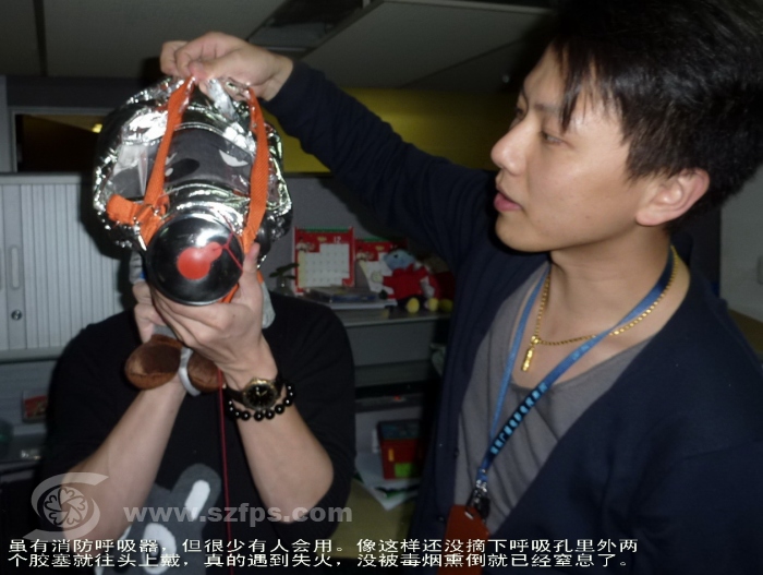 3月最后一天的下午2点半,深圳广电大厦进行消防演习。其实,有些人还不到2点就已经开始准备了,他们早早打开自己的一次性使用的消防呼吸器,琢磨着如何佩戴。因为配发的呼吸器去年7月就过期了,所以试戴并不会造成浪费。戴过的人说,呼吸器里面的气味的确不好闻,但有些人还是愿意多戴一会儿,拍个照、发个围脖做个纪念。
