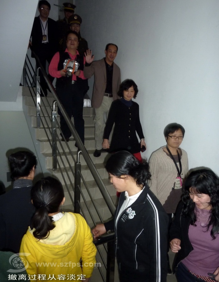 虽然红色的警铃始终一声不响,到了演习开始时间,大家还是按照预案,跟着经警沿消防梯撤离,在消防通道,我们听到了广播通知。因为各部门不是同时涌向消防梯,可供双人并行的消防梯并不拥挤,完全可以用“秩序井然”来描述。一些穿高跟鞋的女士边走边叫苦,其实,叫苦也没有用,既不能停下来休息,更别指望谁背她下楼,演习毕竟是演习,不可能出现敢于“救美”的勇士。