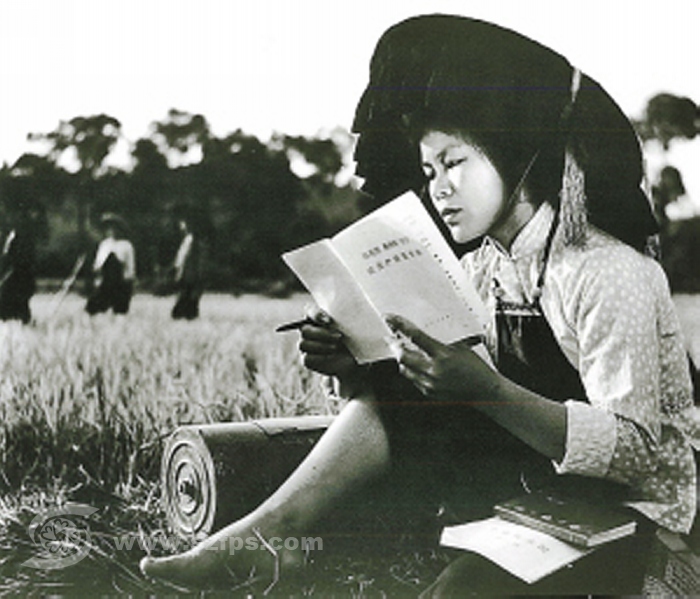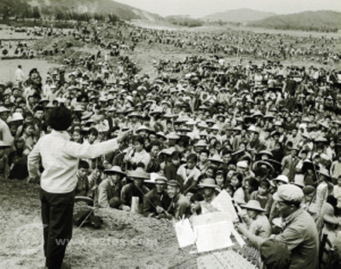 1974年,省文艺工作者参加劳动并在休息时表演节目鼓动干劲。