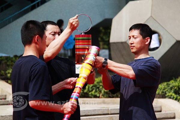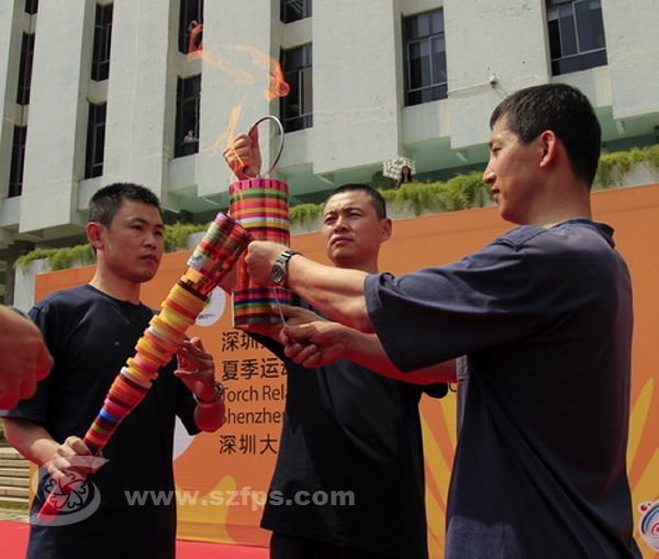 昨天使用的火炬是真火炬,用于交接的两支火炬,一支是去年广州亚运会时使用过的;一支是今年大运会的火炬样本,这支火炬色彩非常鲜艳,以红黄色调为主,立体感很强,椭圆形、彩色切片可以任意旋转,从而可让火炬呈现各种造型。据透露,除色彩有可能微调,届时大家看到的“火炬真容”将与这支相差无几。