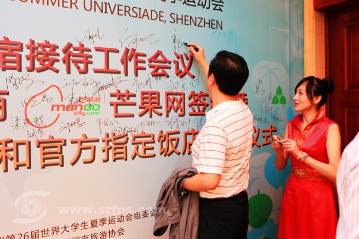 4月28日下午,深圳第26届世界大学生夏季运动会酒店住宿接待工作会议暨大运会供应商芒果网签约和第二批官方饭店和官方指定饭店在深圳授牌。大运会执委会副主席、执行局局长梁道行等嘉宾,为获选成为官方饭店和官方指定饭店的第二批25家饭店授牌。同时,大运会执行局与芒果网签订了大运会酒店及旅游预订服务类供应商合同。