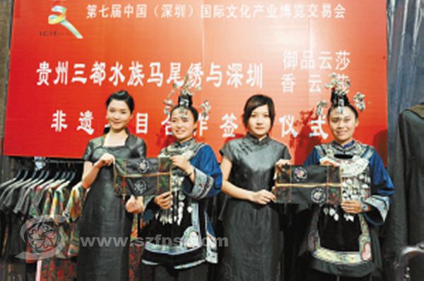 昨日下午,文博会主会场4号“非遗”馆见证时尚一幕:来自深圳的“非遗”活化品牌香云纱及御品云纱,与入选首批国家级非物质文化遗产名录的贵州三都水族马尾绣,签订了旅游商品开发合作框架协议。岭南朴质、生态的香云纱上,将增一块浪漫的、来自大西南的马尾绣。