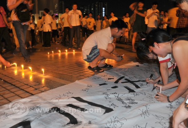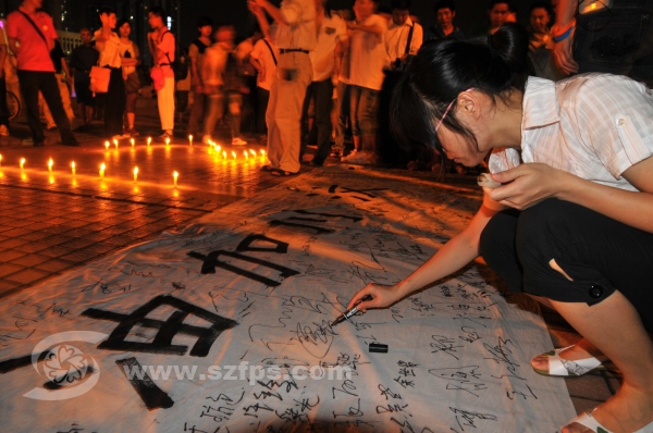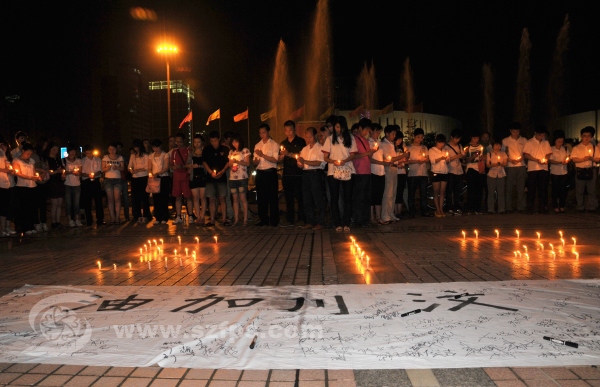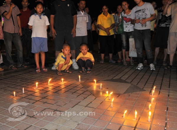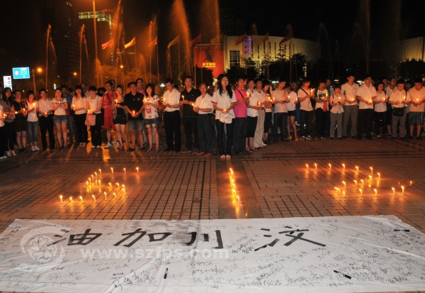 5月12日是“5.12”地震三周年纪念日,深圳龙岗区义工联爱心助学组组织100多名义工到龙城广场,点燃蜡烛为在地震中不幸遇难的同胞默哀及为生还者祈福,义工们还特意制作了一条“汶川加油”的签名条幅,数百名居民群众也自觉加入到纪念活动中来。